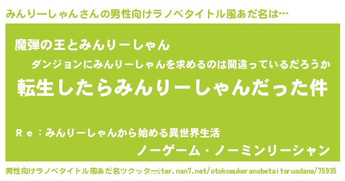 | 女子向けラノベタイトル風あだ名 | 『みんりーしゃんの玉の輿計画!』 |