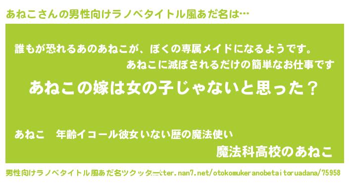 | 女子向けラノベタイトル風あだ名 | 『あねこ様がみてる』 |