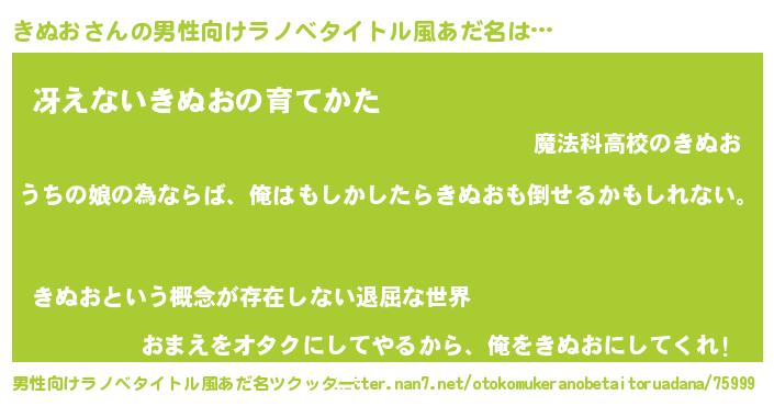 | 女子向けラノベタイトル風あだ名 | 『きぬおの婚約者』『きぬお恋絵巻』 |