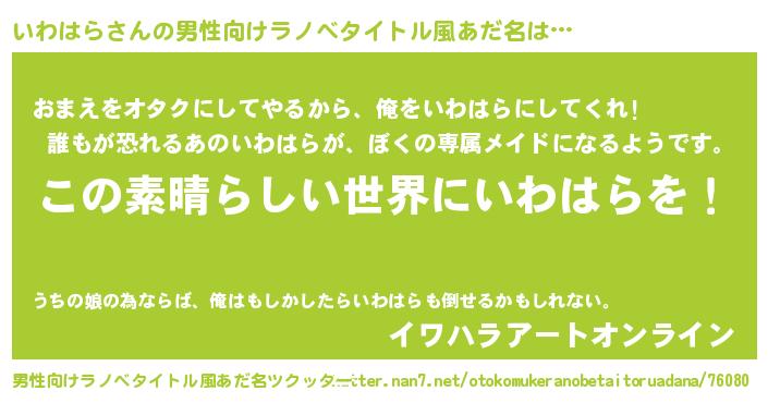 | 女子向けラノベタイトル風あだ名 | 『乙女ゲームの破滅フラグしかない悪役いわはらに転生してしまった…』 |