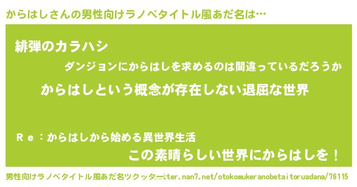 | 胡散臭い通販商品みたいなあだ名 | 『絶対に幸福をもたらす水素水…その名も「からはし」』 |