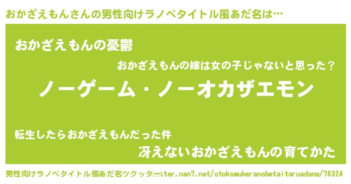 | 女子向けラノベタイトル風あだ名 | 『死神おかざえもんの再婚』 |