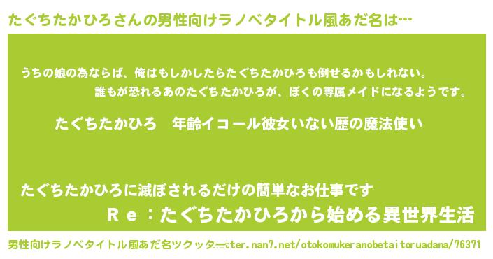 | 女子向けラノベタイトル風あだ名 | 『たぐちたかひろの玉の輿計画!』 |