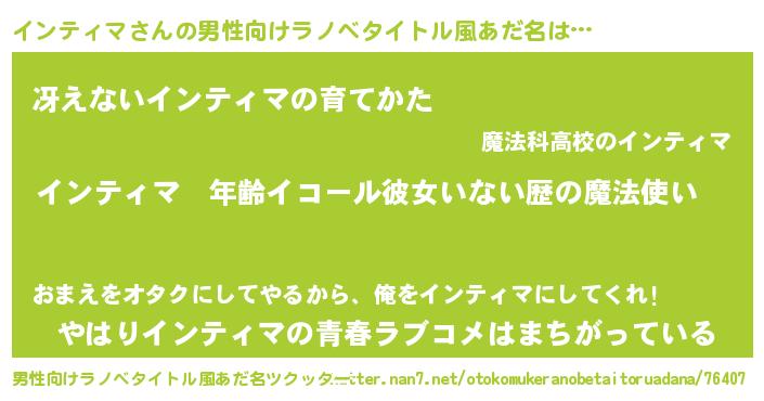 | 女子向けラノベタイトル風あだ名 | 『インティマの玉の輿計画!』 |