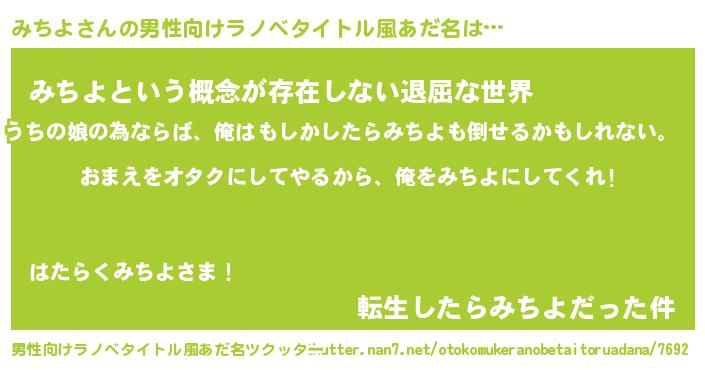 | ヒーロー風カッコイイあだ名 | 『正義の使者みちよ』『ネオミチヨ』 |