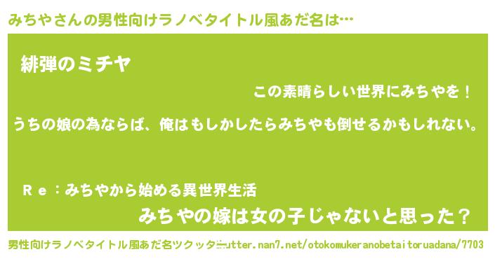 | 女子向けラノベタイトル風あだ名 | 『みちや伯爵の花嫁』『みちや様がみてる』 |
