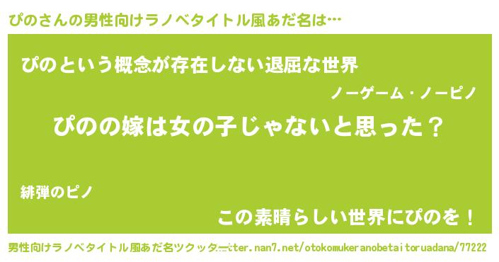 | 女子向けラノベタイトル風あだ名 | 『ぴの様がみてる』『死神ぴのの再婚』 |