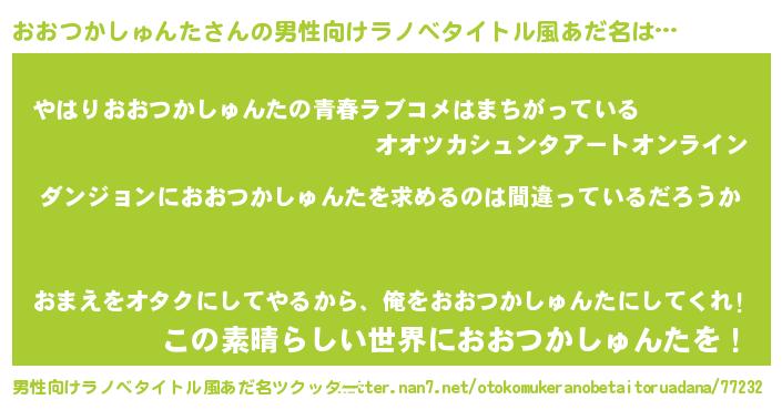 | 女子向けラノベタイトル風あだ名 | 『おおつかしゅんたの卵を拾いまして』 |