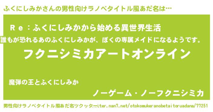 | 女子向けラノベタイトル風あだ名 | 『誰かこのふくにしみかを説明してください! ~契約から始まるウェディング~』 |