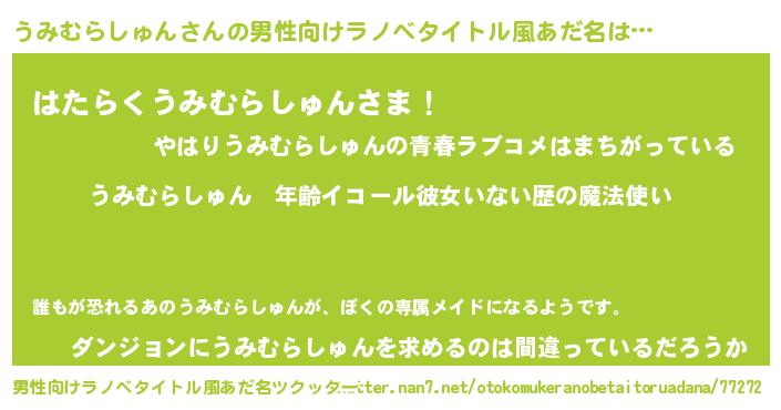 | 女子向けラノベタイトル風あだ名 | 『うみむらしゅんの玉の輿計画!』 |