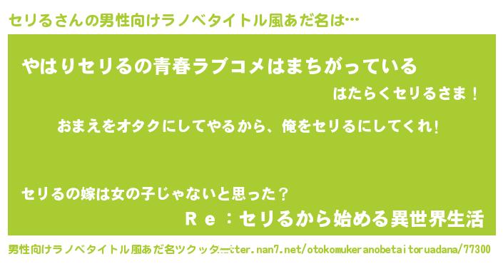 | 女子向けラノベタイトル風あだ名 | 『セリる夫妻のなれそめ』 |