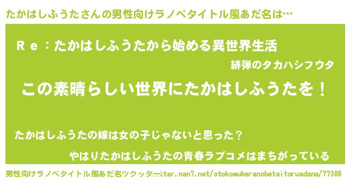| 女子向けラノベタイトル風あだ名 | 『乙女ゲームの破滅フラグしかない悪役たかはしふうたに転生してしまった…』 |