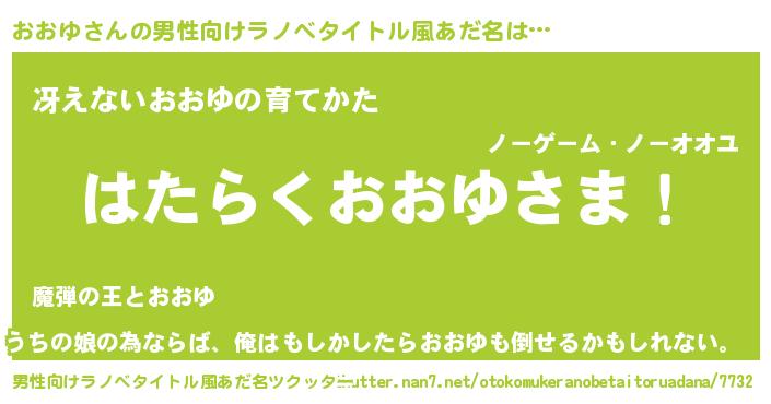| 女子向けラノベタイトル風あだ名 | 『首の姫と首なしおおゆ』『おおゆ恋絵巻』 |