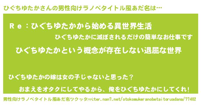 | 女子向けラノベタイトル風あだ名 | 『異世界で失敗しない100のひぐちゆたか』 |