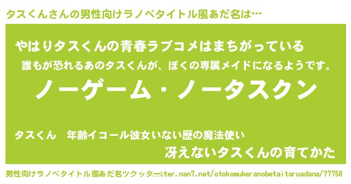 | 女子向けラノベタイトル風あだ名 | 『死神タスくんの再婚』 |