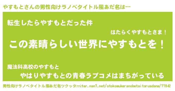 | 女子向けラノベタイトル風あだ名 | 『悪役やすもとに転生したようですが、知った事ではありません』 |