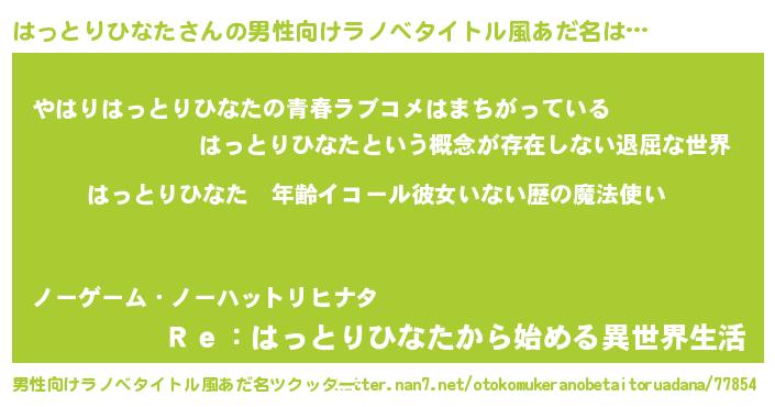 | 胡散臭い通販商品みたいなあだ名 | 『運命の人と巡り会える高級そうな絵画…その名も「はっとりひなた」』 |