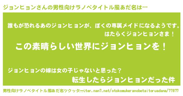 女子向けラノベタイトル風あだ名 | 『乙女ゲームの破滅フラグしかない悪役ジョンヒョンに転生してしまった…』 |