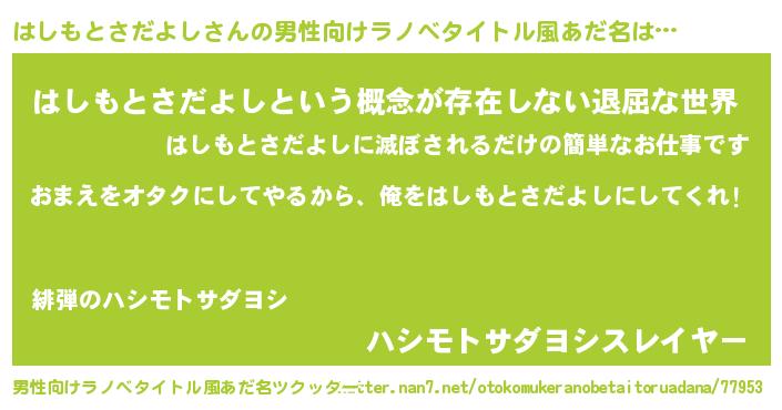 | 女子向けラノベタイトル風あだ名 | 『はしもとさだよし夫妻のなれそめ』 |