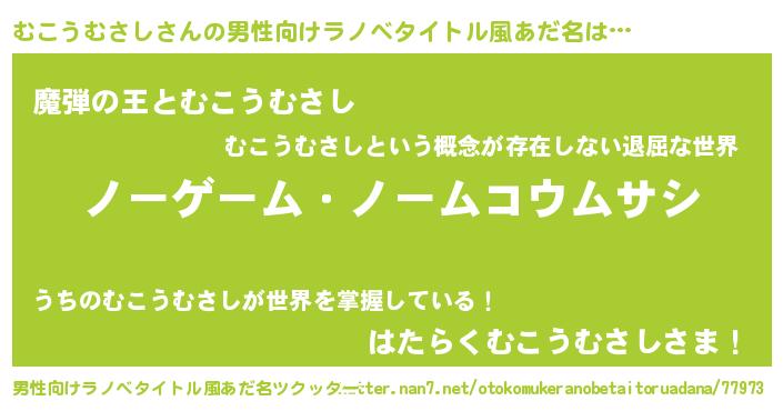 | 女子向けラノベタイトル風あだ名 | 『死神むこうむさしの再婚』 |