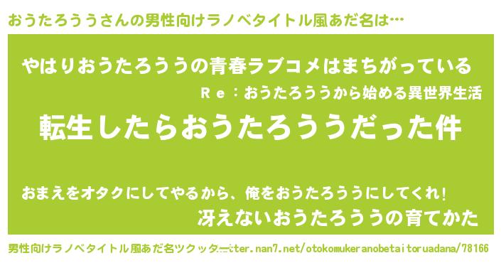 | 女子向けラノベタイトル風あだ名 | 『おうたろううの玉の輿計画!』 |