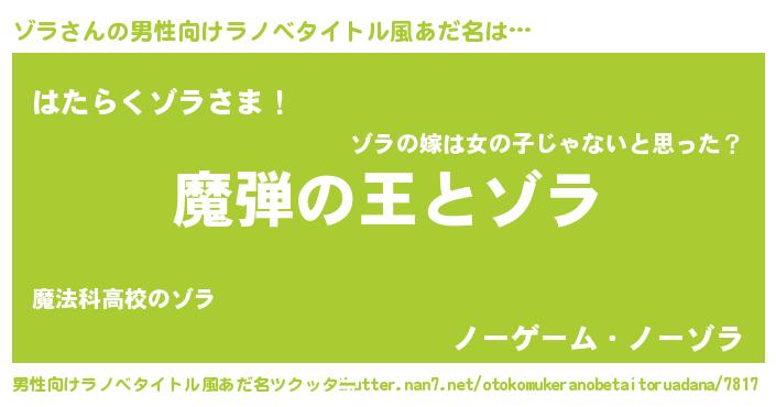 | 女子向けラノベタイトル風あだ名 | 『乙女ゲームの破滅フラグしかない悪役ゾラに転生してしまった…』 |