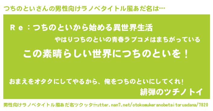 | 女子向けラノベタイトル風あだ名 | 『乙女ゲームの破滅フラグしかない悪役つちのといに転生してしまった…』 |
