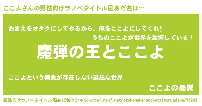 | 女子向けラノベタイトル風あだ名 | 『ここよが死なない童話 林檎のここよの診療簿』 |