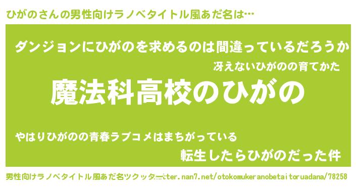 | 女子向けラノベタイトル風あだ名 | 『ひがのなんてお断りですっ。』 |