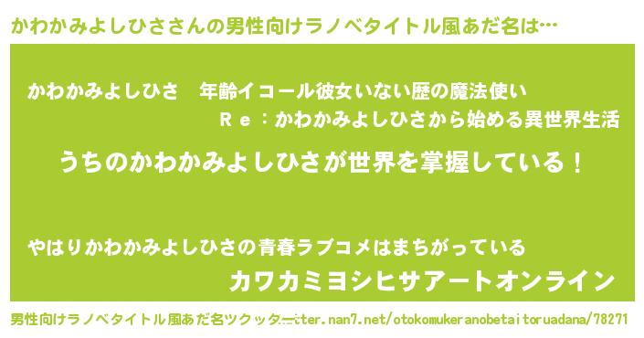 | 胡散臭い通販商品みたいなあだ名 | 『億万長者になれる霊験あらたかなお札…その名も「かわかみよしひさ」』 |