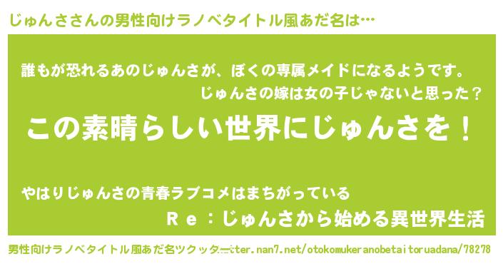| 女子向けラノベタイトル風あだ名 | 『悪役じゅんさに転生したようですが、知った事ではありません』 |
