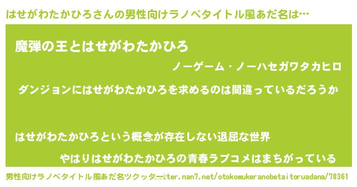 | 女子向けラノベタイトル風あだ名 | 『はせがわたかひろの卵を拾いまして』 |