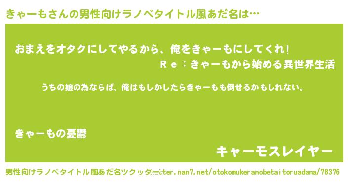 | 女子向けラノベタイトル風あだ名 | 『きゃーもの婚約者』『闇のきゃーも』 |