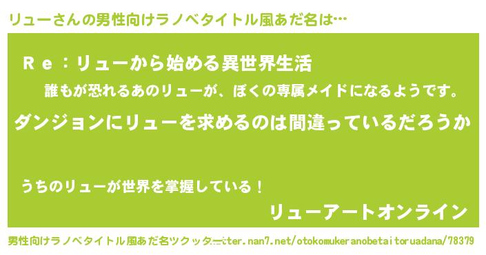 | 女子向けラノベタイトル風あだ名 | 『リューの卵を拾いまして』『闇のリュー』 |