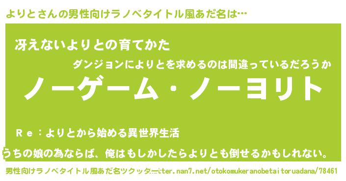 | 女子向けラノベタイトル風あだ名 | 『死神よりとの再婚』『よりとの婚約者』 |