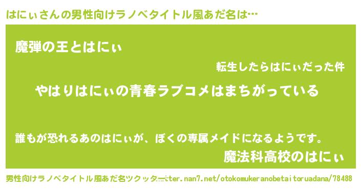 | 女子向けラノベタイトル風あだ名 | 『はにぃ伯爵の花嫁』 |
