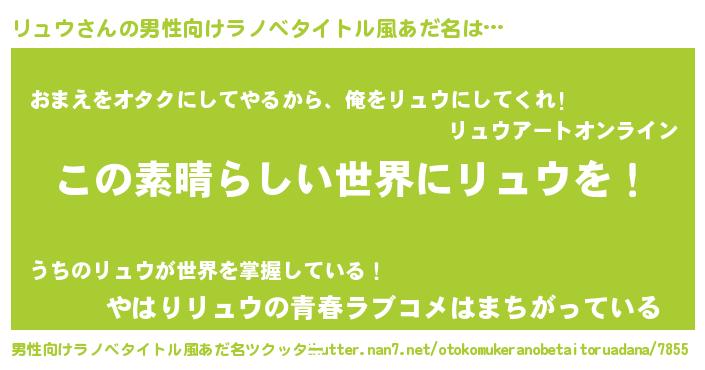 | 女子向けラノベタイトル風あだ名 | 『乙女ゲームの破滅フラグしかない悪役リュウに転生してしまった…』 |