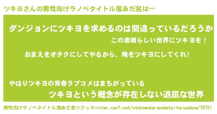| 女子向けラノベタイトル風あだ名 | 『ツキヨ恋絵巻』『ツキヨは平凡を望む』 |