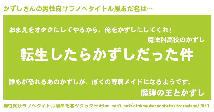 | 女子向けラノベタイトル風あだ名 | 『婚約破棄系悪役かずしに転生したので、保身に走りました。』 |