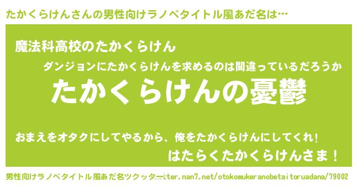 | 女子向けラノベタイトル風あだ名 | 『(仮)たかくらけんのやんごとなき事情』 |