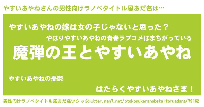 | 女子向けラノベタイトル風あだ名 | 『やすいあやねが死なない童話 林檎のやすいあやねの診療簿』 |