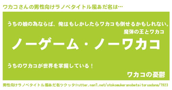 | 女子向けラノベタイトル風あだ名 | 『死神ワカコの再婚』『ワカコの婚約者』 |