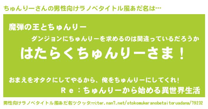 | 意味不明あだ名 | 『住所不定無職ちゅんりー(12歳)』 |