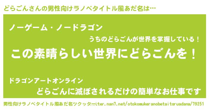 | 女子向けラノベタイトル風あだ名 | 『悪役どらごんに転生したようですが、知った事ではありません』 |