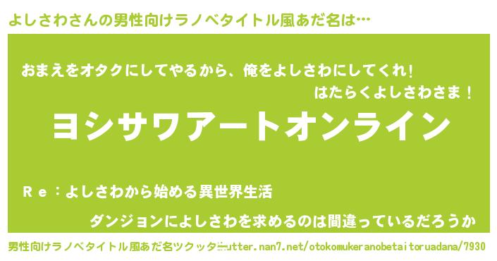 | 女子向けラノベタイトル風あだ名 | 『誰かこのよしさわを説明してください! ~契約から始まるウェディング~』 |