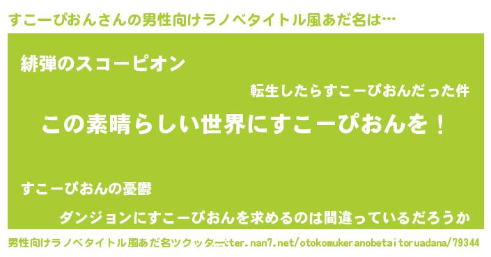 | 胡散臭い通販商品みたいなあだ名 | 『あなたにだけ特別に提供する100年もののヴィンテージワイン…その名も「すこーぴおん」』 |