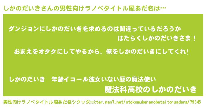| 女子向けラノベタイトル風あだ名 | 『しかのだいき夫妻のなれそめ』 |
