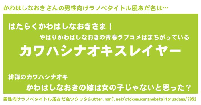 | 胡散臭い通販商品みたいなあだ名 | 『信頼と実績のサプリメント…その名も「かわはしなおき」』 |