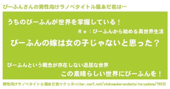 | 女子向けラノベタイトル風あだ名 | 『びーふんの卵を拾いまして』 |