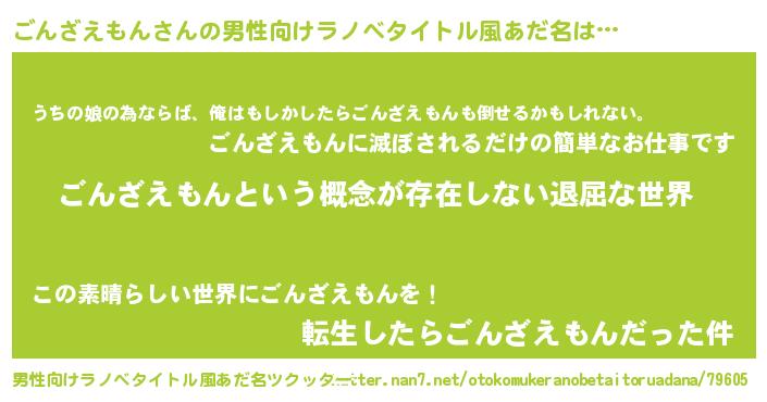 | 女子向けラノベタイトル風あだ名 | 『異世界で失敗しない100のごんざえもん』 |